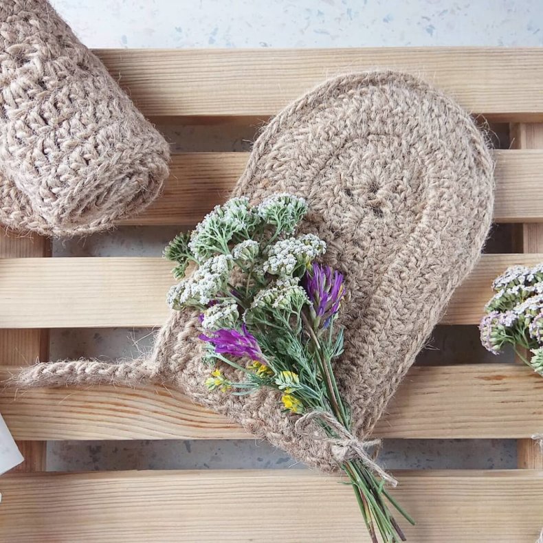 Чтобы банный аксессуар имел ручки, их можно связать, либо пришить тесьму, например, из хлопчатобумажной ткани.