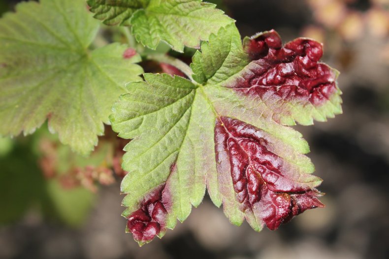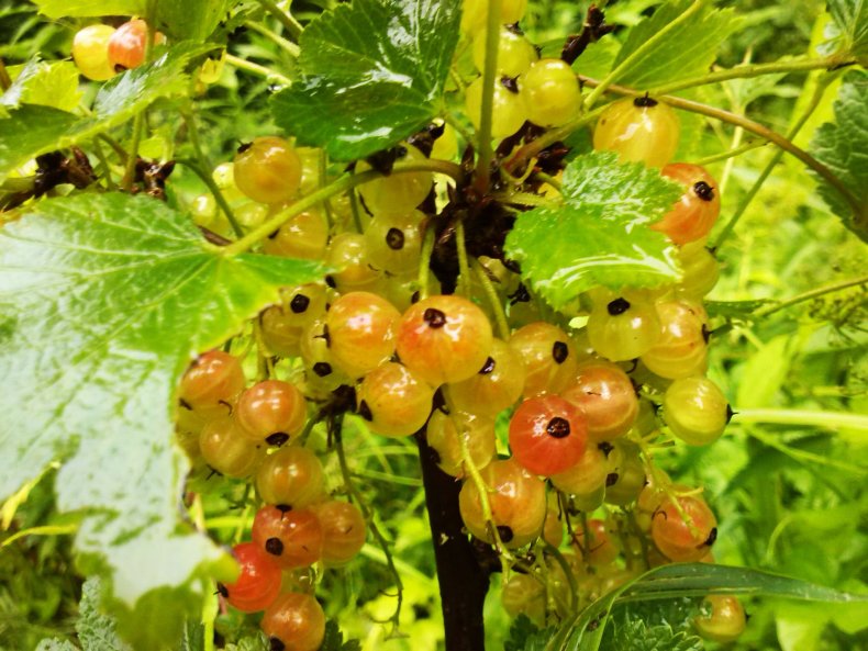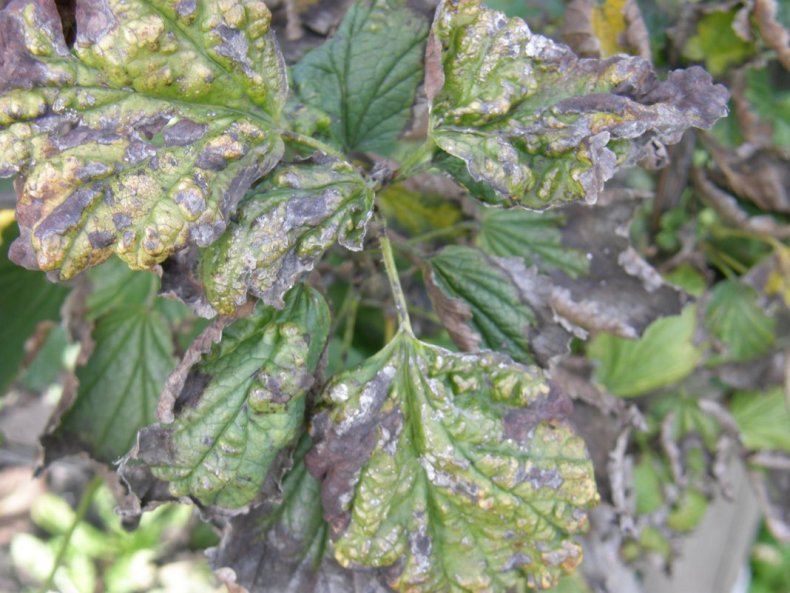 - Железо. Ягодки мельчают, кустарник останавливается в росте, количество урожая падает. Листья смородины начинают белеть.