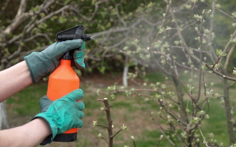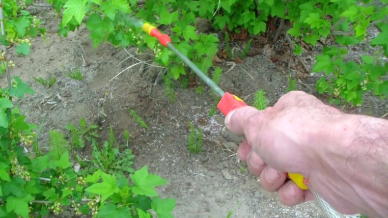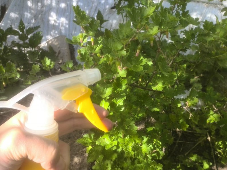 - Готовый раствор разводят один к десяти и проливают потом кустарники.