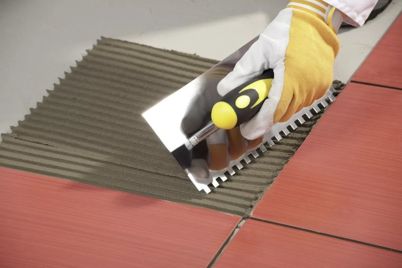 Стоит отметить, что по уложенной плитке нельзя перемещаться, пока она хорошо не схватится с клеем. Начинать работу лучше всего от двери, двигаясь вглубь помещения.