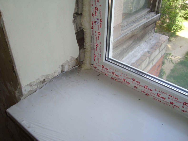 - Пену оконного проема также вырезают на глубине порядка 2 см, чтобы обеспечить заход подоконника под оконную раму.