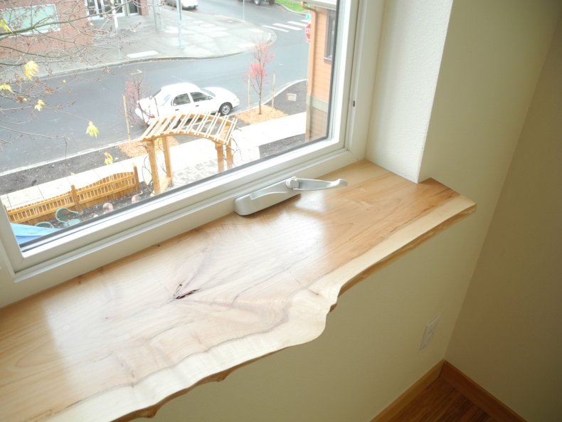 - Деревянные подоконники стали использоваться реже, хотя в загородных домах данный материал смотрится гармонично. Дерево выглядит солидно, однако боится влажности и требует специальной обработки.