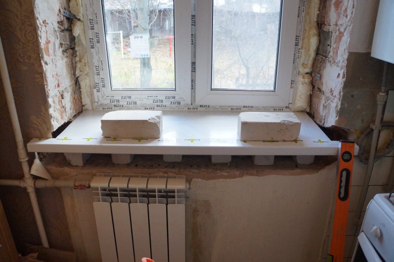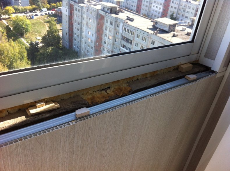 Плита подоконника ставится на подпорки, которые предварительно вырезаются из древесины или из части ПВХ-плиты. Подпорки монтируются каждые 50 см.