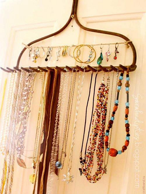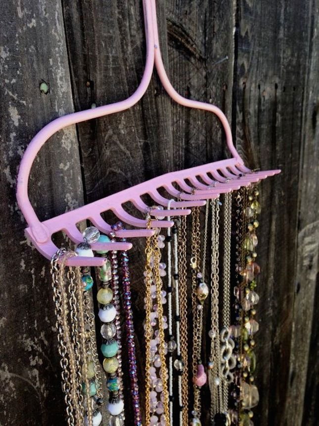 - Интересную вешалку для цепочек, ожерелий и бус мы можем сделать из граблей, а точнее из их металлического наконечника.