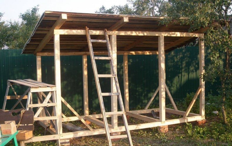 Настил может быть, как односкатным и более, так и с уклоном. И желательно со свесами. В этом случае кровля будет больше каркаса. При минимальном вылете 20 см.