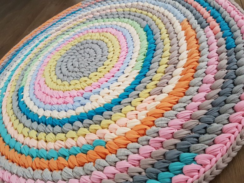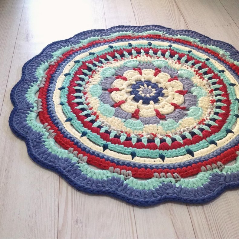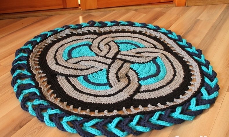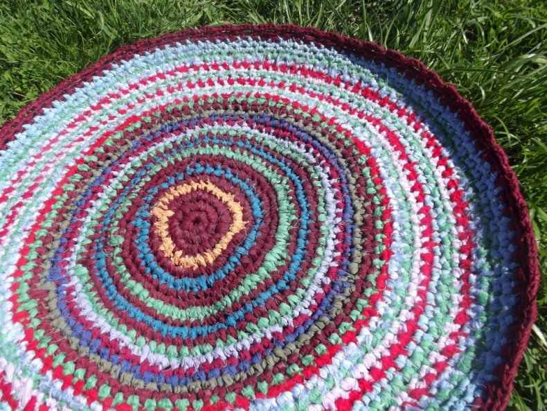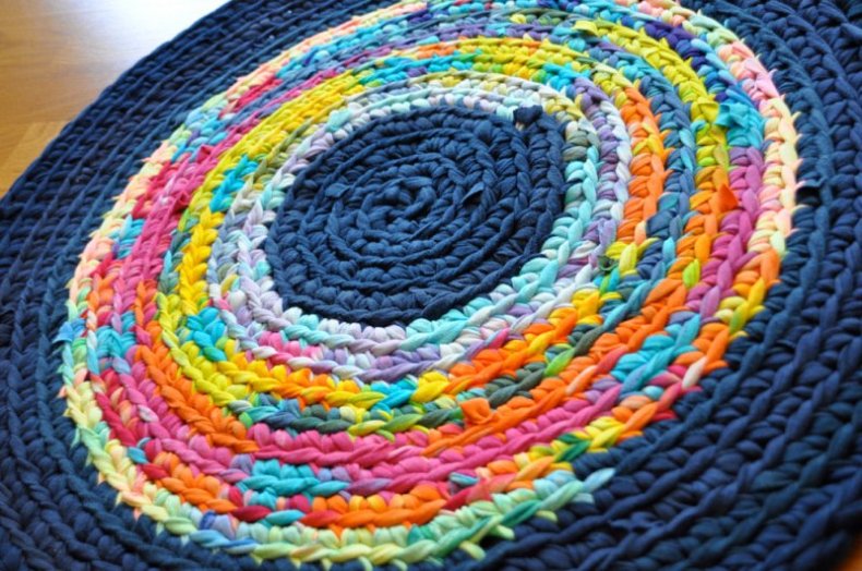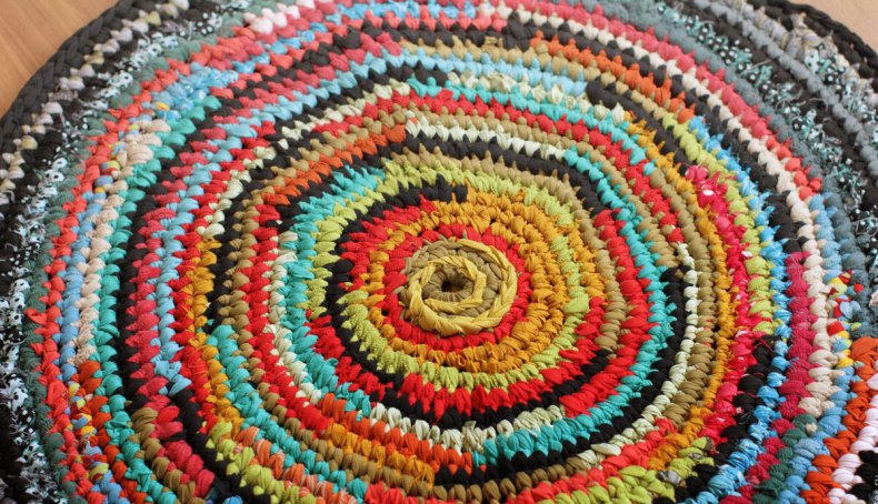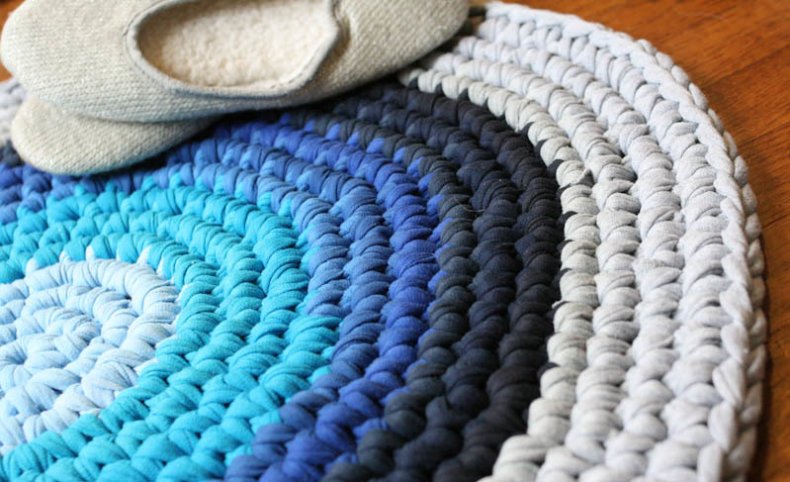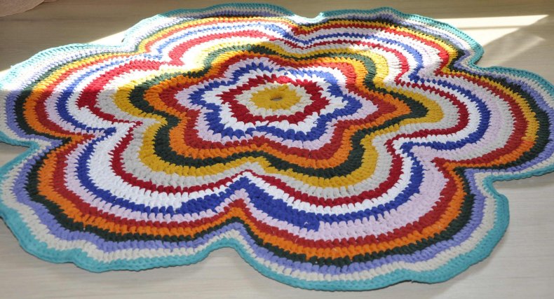 Если использовать ленточные нити или трикотажные из вискозы, хлопка и акрила, можно получить коврик идеальной формы.