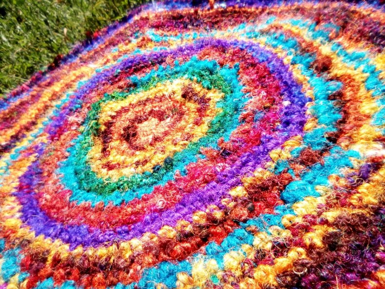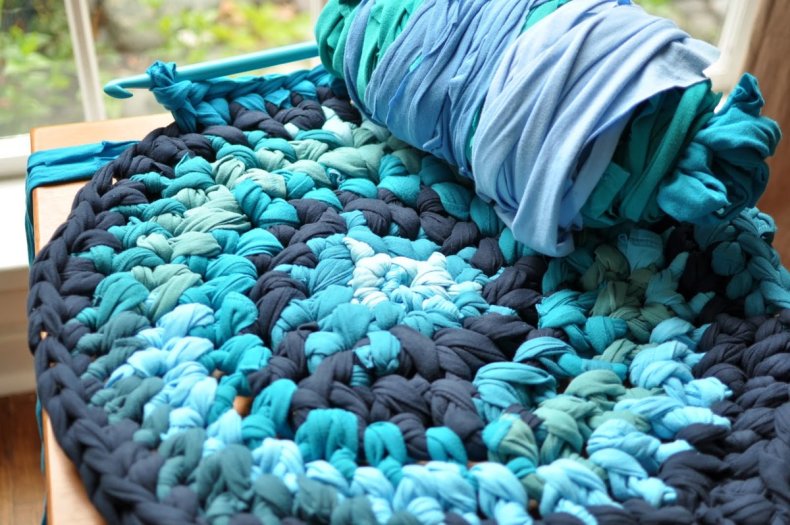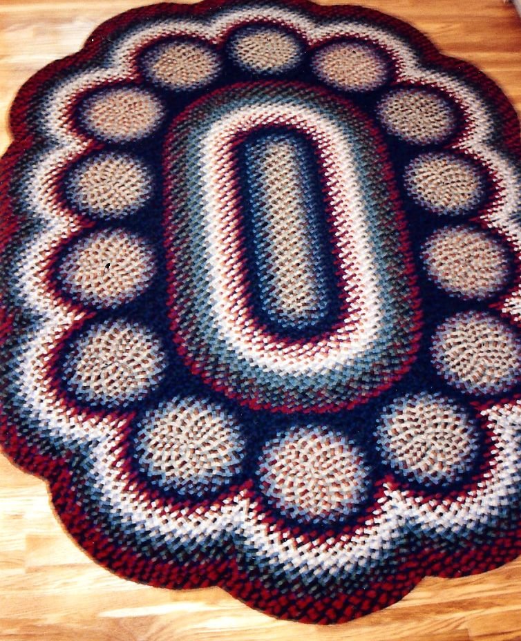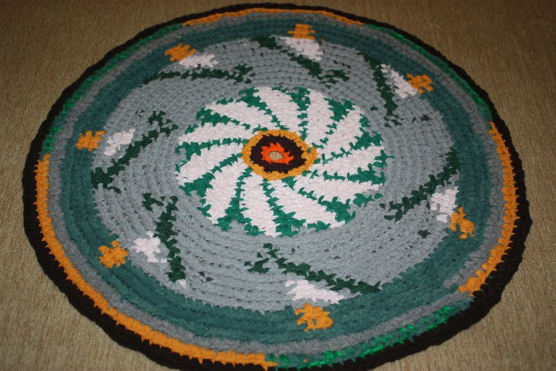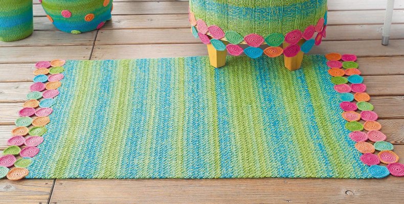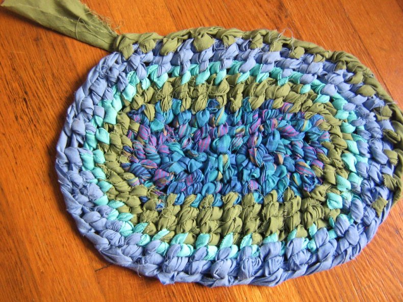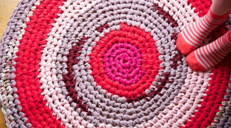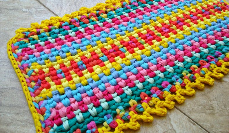 Если использовать ленточные нити или трикотажные из вискозы, хлопка и акрила, можно получить коврик идеальной формы.