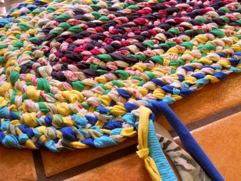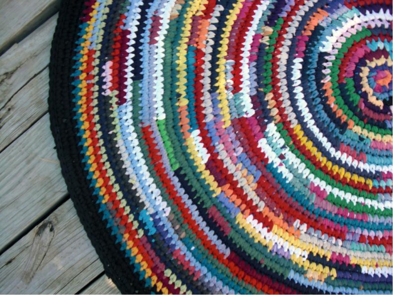 Особенность таких ковриков в том, что для их изготовления необязательно приобретать специальные нити, вполне подойдут лоскутки от ненужных вещей, связанные между собой.