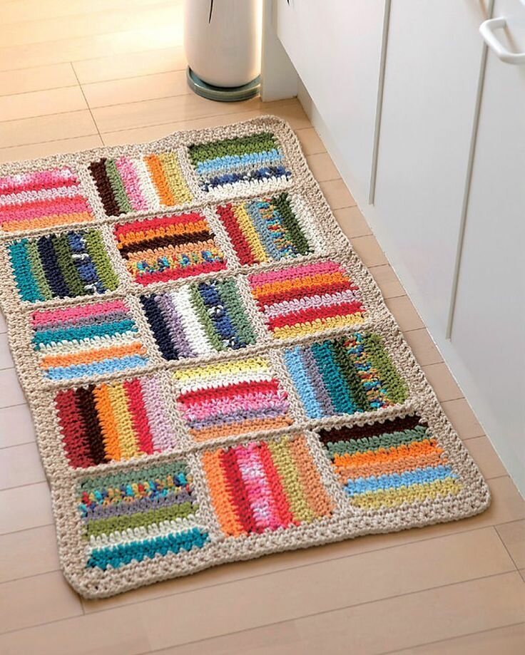 Вязаный коврик при помощи крючка универсален. Он пригодится в качестве элемента декора, как теплый палас в любую комнату.