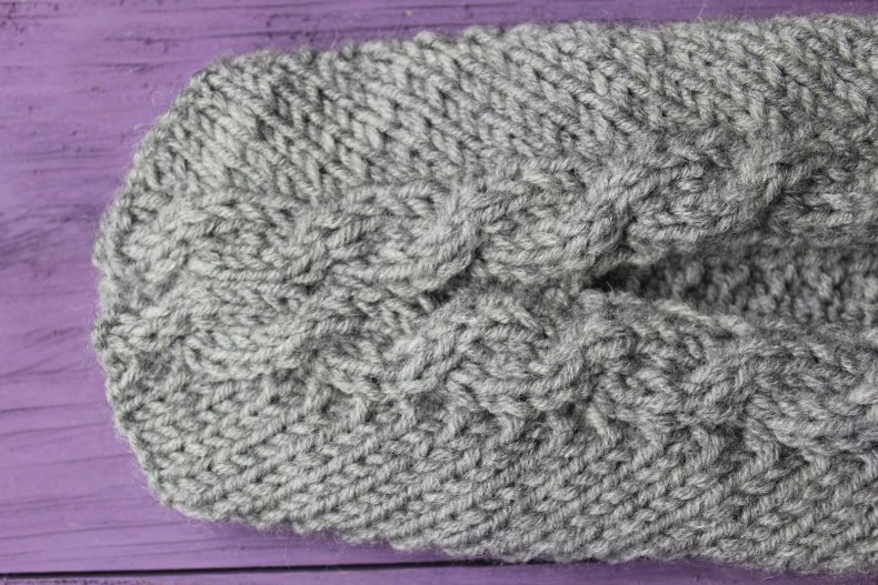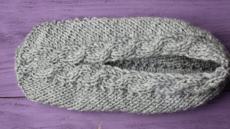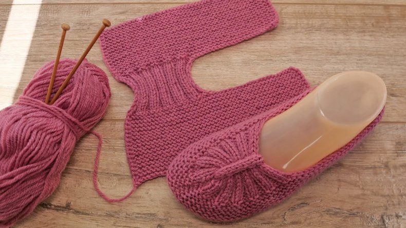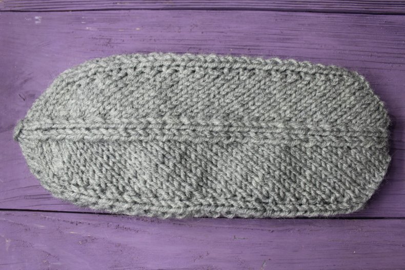 - Перевернуть вязание на лицевую сторону, снять первую петлю и проплести все петли лицевыми, также не довязывая трех петель до конца подошвы. Первую и вторую петлю вязать одной лицевой петлей, последнюю петлю подошвы и следующую боковую петлю провязать.