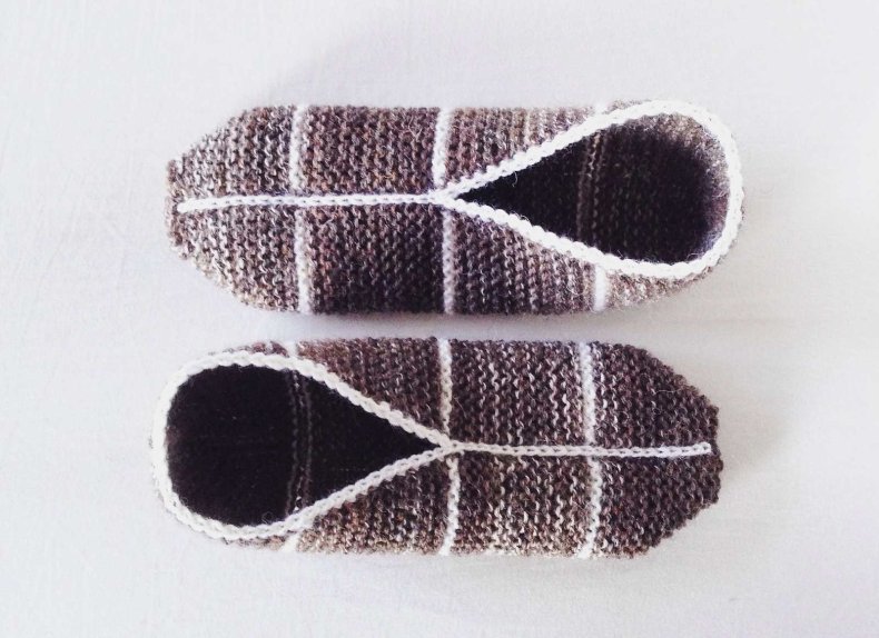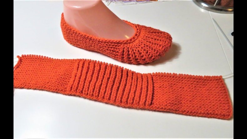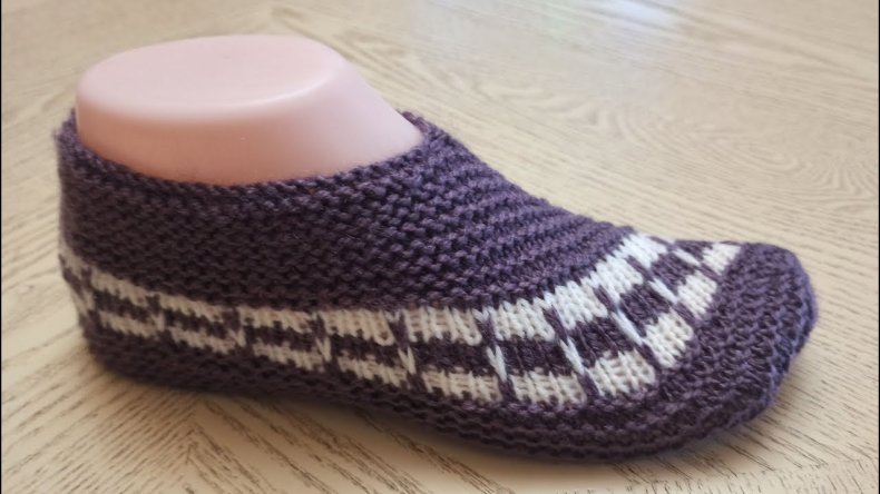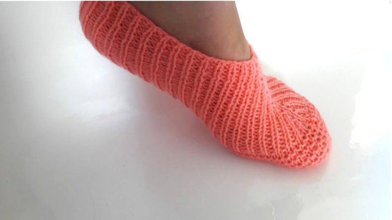 Первая петля снимается, не провязывая и далее вязать все петли лицевыми,не довязывая трех петель до конца подошвы.