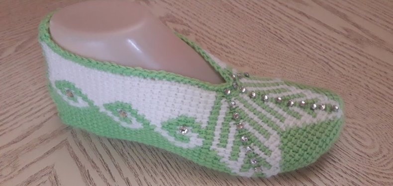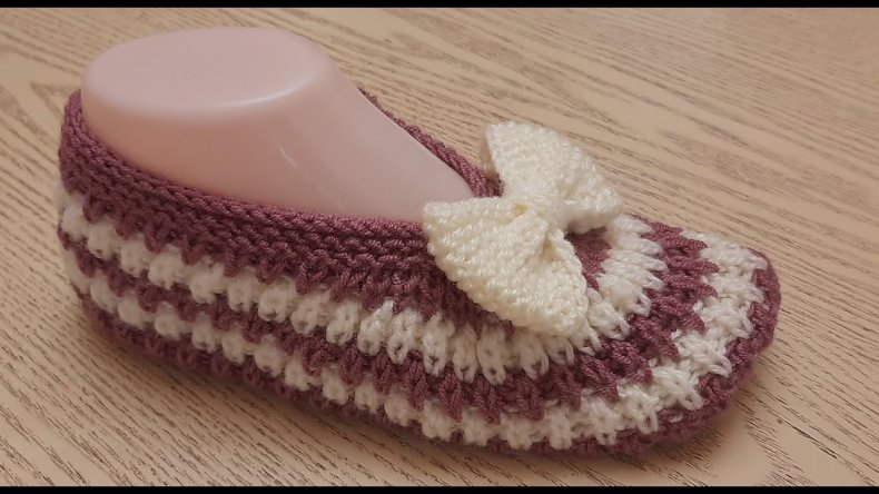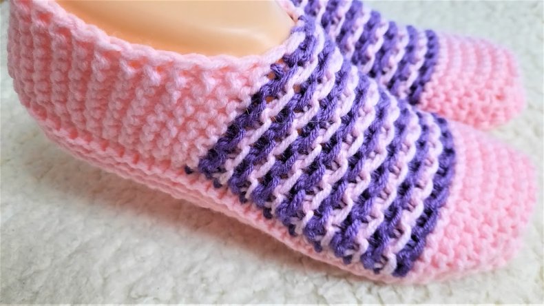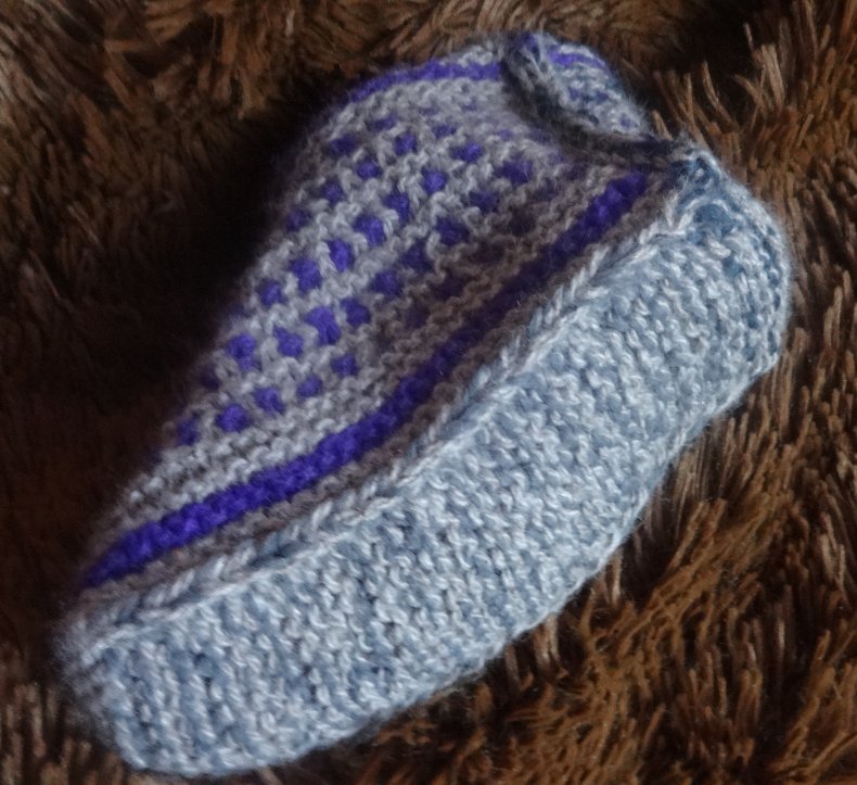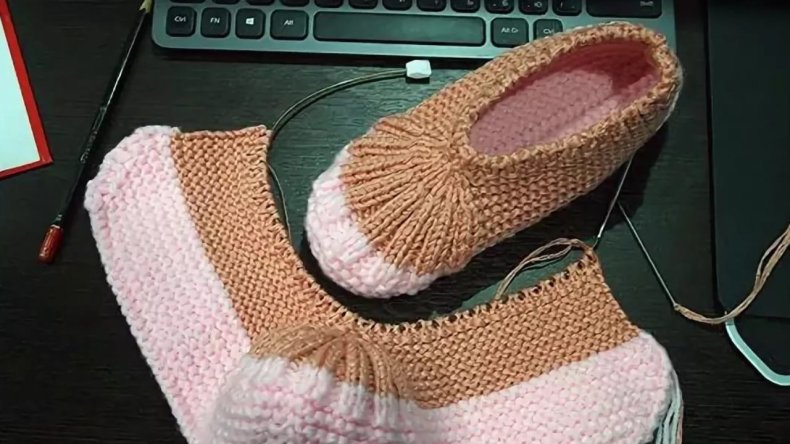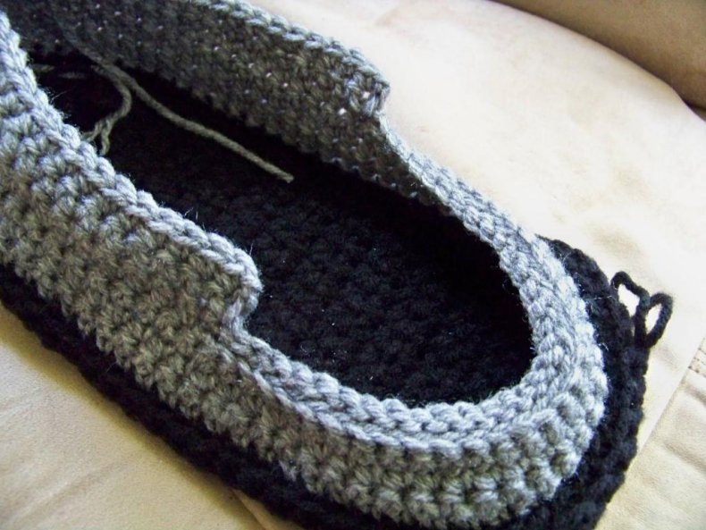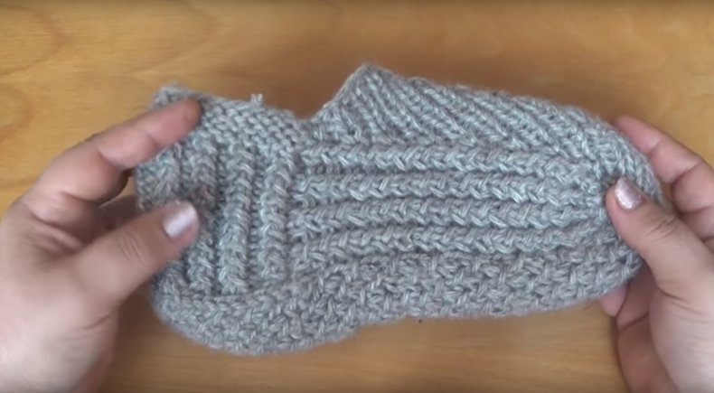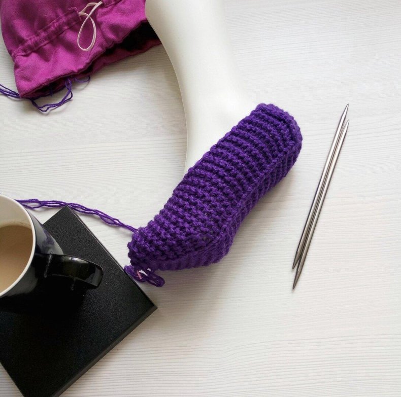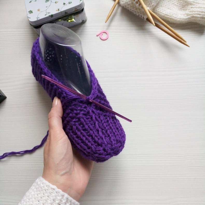 - Далее лицевую сторону проплетаем по примеру прошлых рядов. Вязать, убавляя в каждом ряду по одной петле в подошве и по одной петле в боку, до тех пор, пока все боковые петли не убавятся.