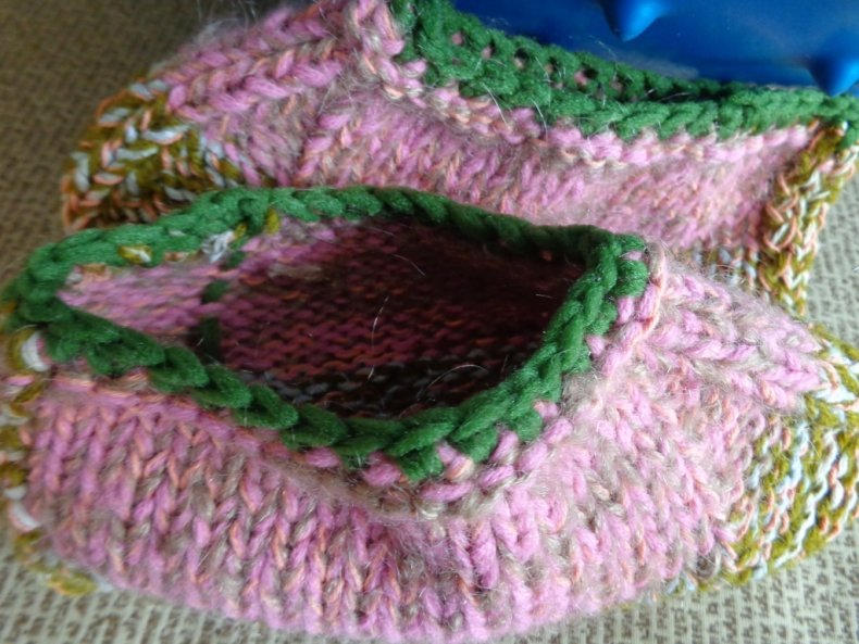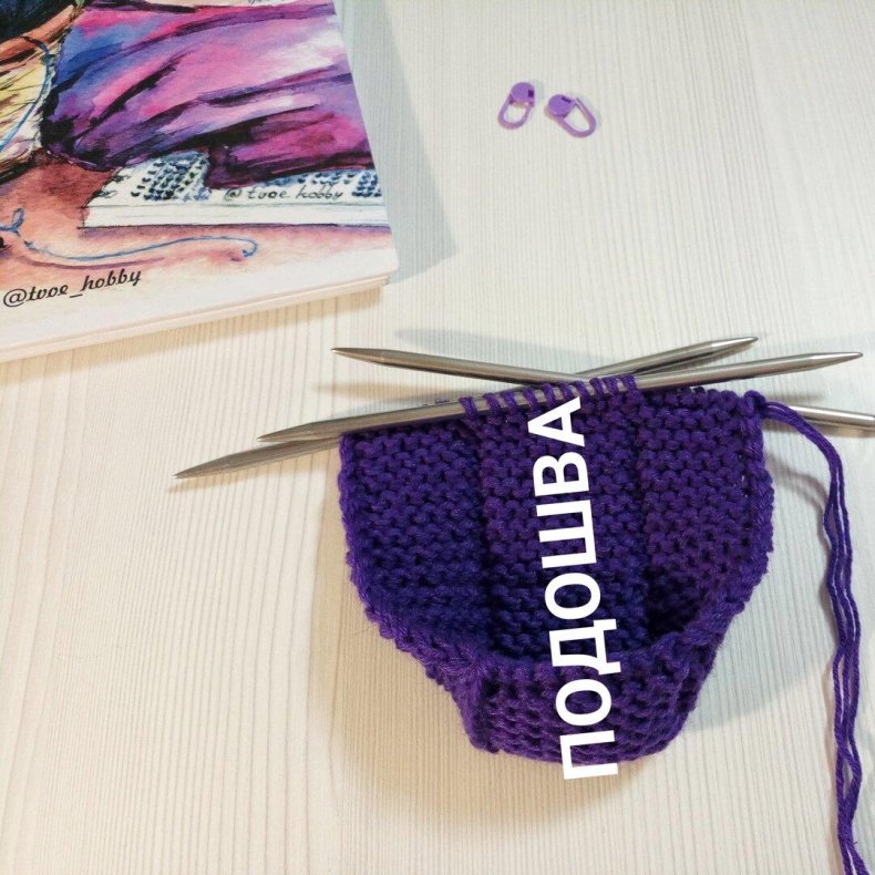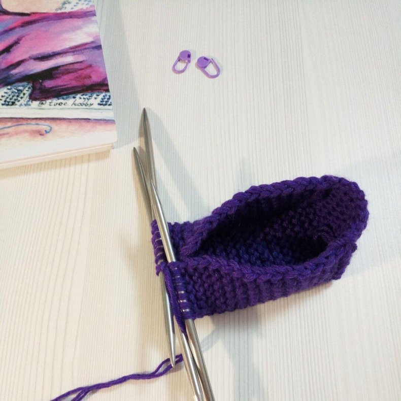 - Первую и вторую петлю провязать одной лицевой, за верхние правые стеночки. Последнюю петлю подошвы и следующую провязать изнаночной петлей, так как это лицевая сторона.
