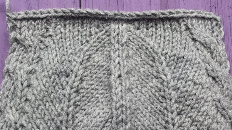 - После перенесения косичек на спицу вязать с левого края лицевыми петлями, последняя кромочная петля вяжется изнаночной.