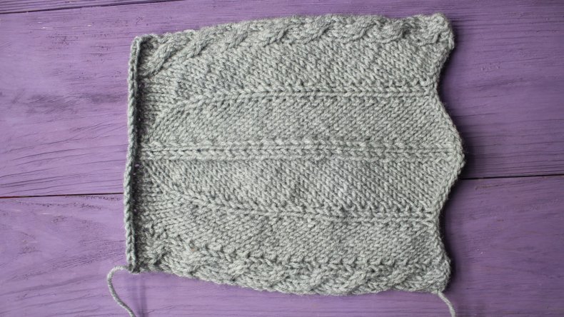В лицевом ряду тринадцатую и двенадцатую петлю провязать одной изнаночной петлей, а в изнаночном ряду двенадцатую и тринадцатую плести одной лицевой петлей. Вязать до тех пор, пока с двух сторон не останется по пять петель.