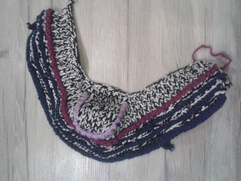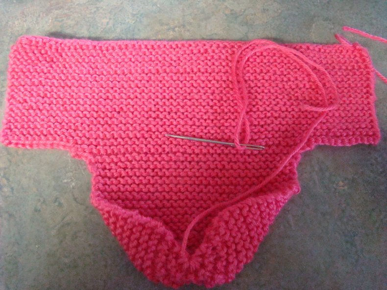 - Три последних петли проплести одной лицевой. Отрезать нитку, протянуть в открытую петлю и конец по изнаночной стороне убрать и сшить две стороны изделия.