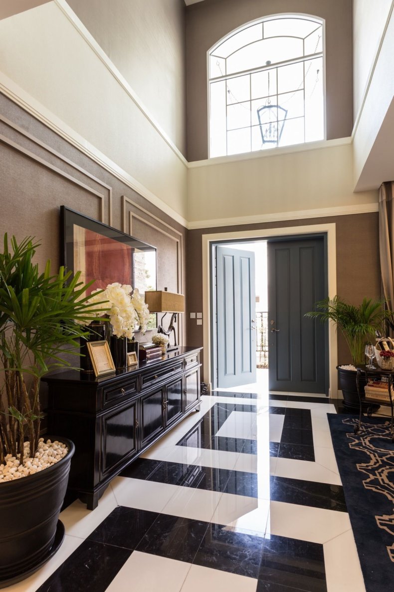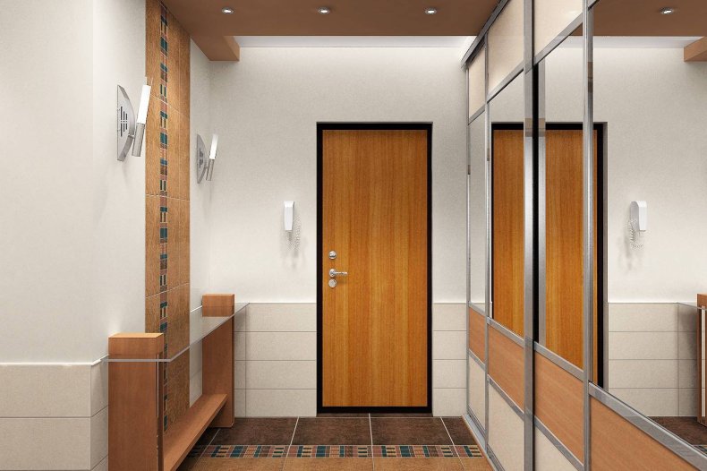 Сделать прихожую интересной и стильной, поможет зеркальная плитка, она создает необычный дизайн, расширяя пространство и еще отражает остальные предметы, интересно обыгрывая это.