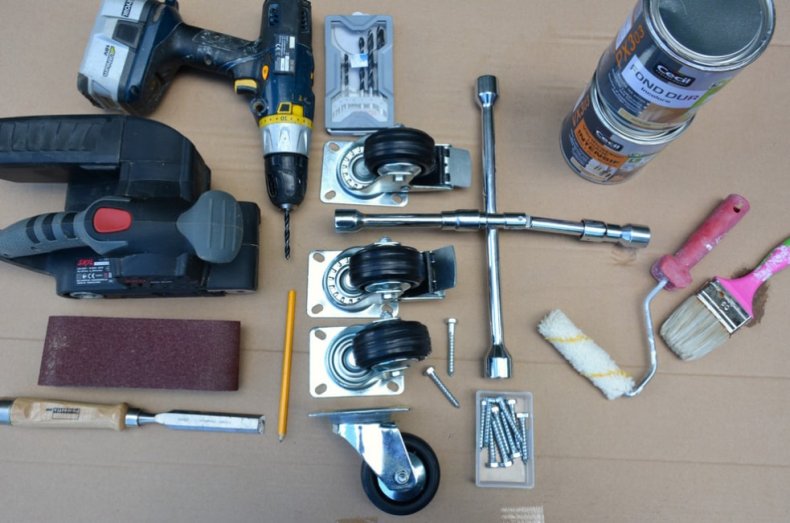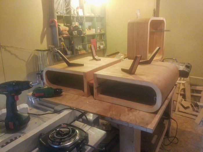 Приготовьте также четыре крепления для ножек, ножки могут быть конусной формы до сорока сантиметров и, конечно же, перечисленные ранее материалы и элементы дизайна. Также возьмите дрель, сверла, струбцины.